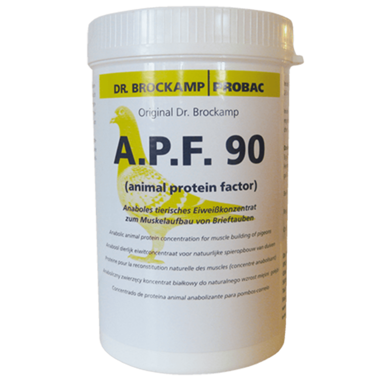 Białko zwierzęce jest nie tylko niezbędne do życia, lecz przede wszystkim niezastąpione w podnoszeniu wydajności w sporcie wyczynowym. Gołębie pocztowe pobierają do ok. 10% zapotrzebowania energetycznego z rezerw proteinowych, co następuje w znacznym stopniu poprzez „rozbiórkę” tkanki mięśniowej, wskutek czego w okresie znacznej aktywności fizycznej tracą one z tygodnia na tydzień masę. Mięśnie potrzebują do ich szybkiej regeneracji protein. A.P.F. jest naturalny środkiem wiążącym mięśnie, ma więc działanie anaboliczne. W sezonie lotów największy przyrost tkanki mięśniowej odbywa się w czasie odpoczynku, a więc w nocy. Dlatego zaleca się stosowanie A.P.F. 90 już wieczorem przed dniem lotu. Wraz z coraz większym stopniem trudności lotów można przedłużyć podawanie A.P.F. do 2-3 dni.